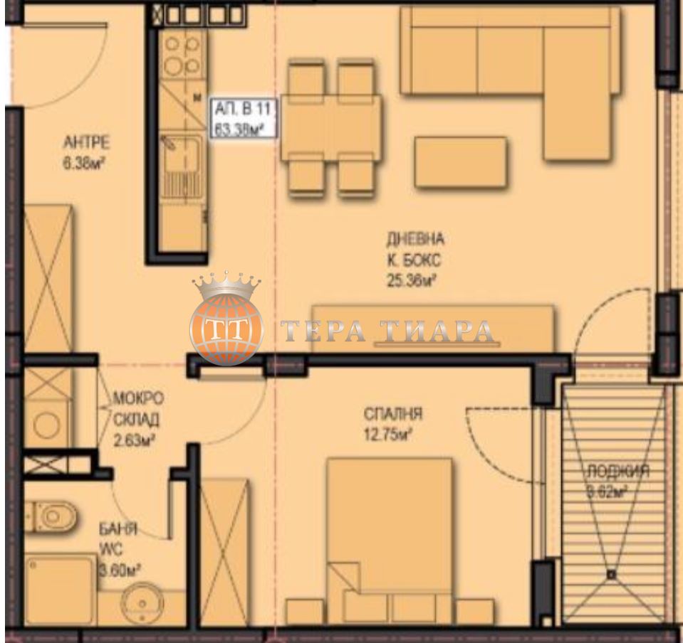 Разпределение: входно антре, мокро помещение, баня с тоалетна, хол с кухненски бокс, спалня и тераса.